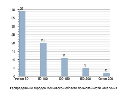 В Московской области на 2019 год насчитывается 74 города[132] (не учитывая городов Москвы с подчинённым ей Зеленоградом, Сходни, вошедшей в состав Химок в 2004 году, Троицка, Щербинки и Московского, вошедших в состав Москвы 1 июля 2012 года), 21 из них имеет население свыше 100 тыс. чел[133]. На территории Московской области существует два типа посёлков, которые формально относятся к населённым пунктам городского типа — дачные посёлки и рабочие посёлки; последние более многочисленны, переписью населения 2010 года в области учтено 60 рабочих посёлков (четыре из которых, являющиеся ЗАТО, образуют городские округа; остальные 56 образуют городские поселения), а дачных посёлков учтено только 12 (все они образуют городские поселения)[115]. Характерной особенностью расселения в Московской области является сезонная субурбанизация. Число садово-огородных посёлков в субъекте значительно превышает число сельских населённых пунктов (в 2008 году 10,6 тыс. и 6,2 тыс. единиц соответственно).
