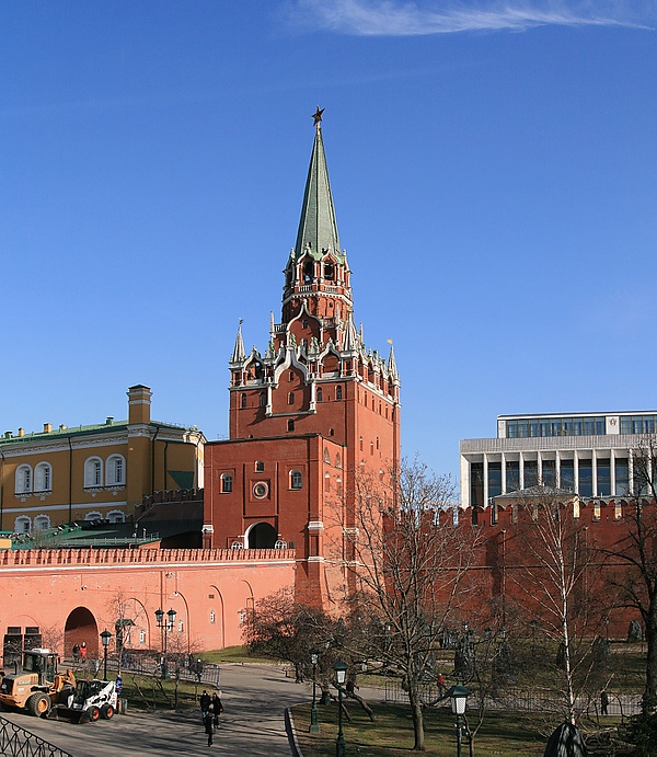 Вдоль стен расположено 20 башен. Три башни, стоящие в углах треугольника, имеют круглое сечение, остальные — квадратное. Самая высокая башня — Троицкая, она имеет высоту 80 м (со звездой, со стороны Александровского сада)[79][80][81].