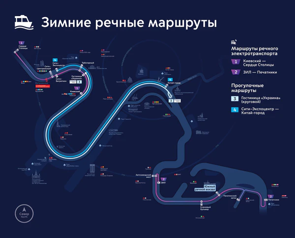 - С запуском 2 регулярных речных маршрутов («Киевский — Сердце Столицы» и «ЗИЛ — Печатники») стали использоваться 21 российское электросудно, 23 плавучих причала, имеющих по 4 береговых зарядных станции, а также 2 пункта технического обслуживания[3].