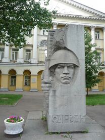 В 1941 году в здании учебного заведения была сформирована 5-я Фрунзенская дивизия народного ополчения, в которую вошли многие преподаватели и студенты вуза[9]. В память о подвигах фронтовиков в 1967 году перед зданием учебного заведения был установлен монумент скульптора Л. Е. Кербеля ополченцам Фрунзенского района. На гранитном памятнике изображена голова военного и выгравированы годы войны[10][11].