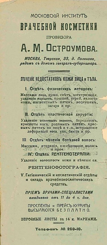 Здание Московского института врачебной косметики А. М. Остроумова располагалось рядом с домом генерал-губернатора по адресу Тверская, 33. В институте занимались лечением недостатков лица и тела[4].