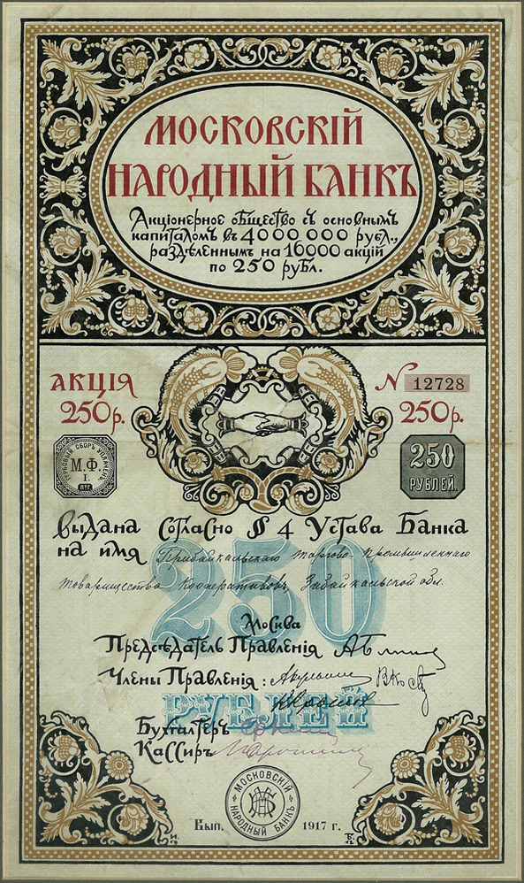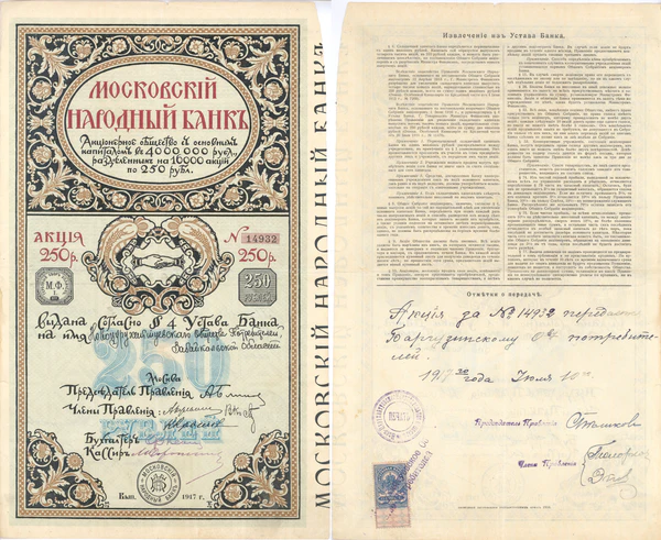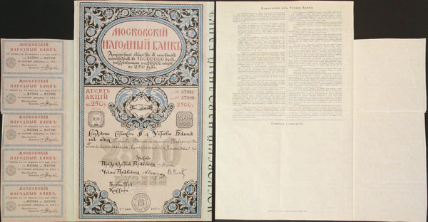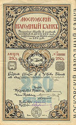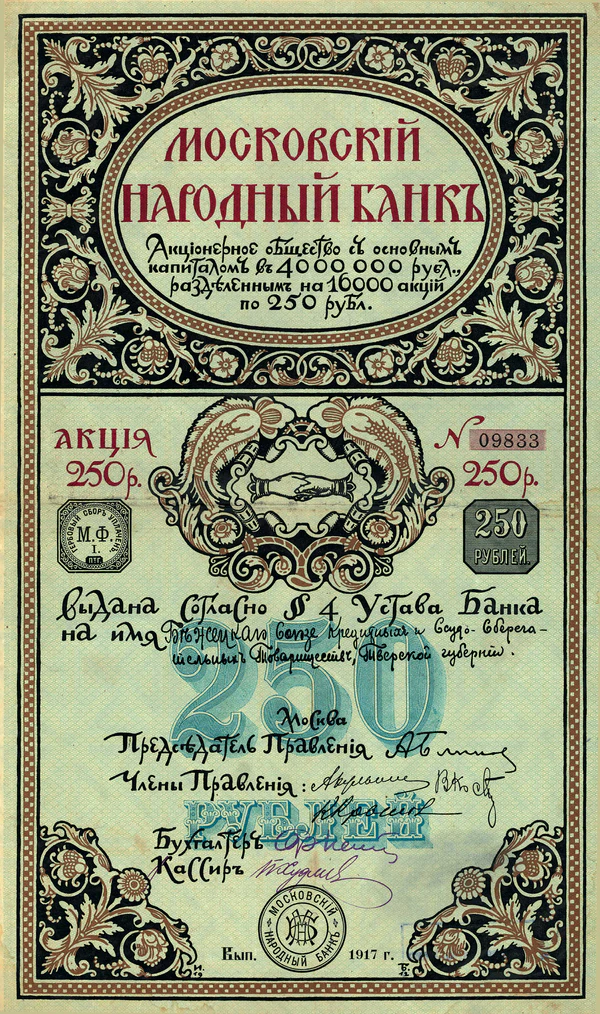 В 1912 году эскизы акций Московского Народного Банка разработал Иван Билибин. На каждой акции имеется подпись великого русского художника и иллюстратора (внизу слева буква «И.» и число 19, справа буква «Б.» и число 12).