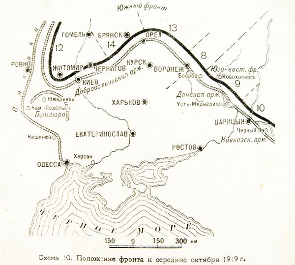 18 августа рухнул фронт большевиков в Новороссии, силы красных в этом регионе (12-я армия) оказались окружены. 23-24 августа войска ВСЮР взяли Одессу, 31 августа — Киев.