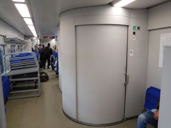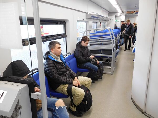 Электропоезда до номера 044 включительно имеют салоны пригородно-городского исполнения на 386 сидений [a] У электропоездов начиная с номера 045 салон имеет городское исполнение на 346 сидений для увеличения вместимости состава и улучшения условий проезда стоячих пассажиров [b] В салонах поездов с номера 045 установлены горизонтальные поручни для удобства стоячих пассажиров по 2 с каждой стороны, за исключением среднего промежуточного вагона, где поручни есть только со стороны, где сиденья расположены в 2 продольных ряда. В промежуточных вагонах с токоприёмником вместо части сидений размещены зоны для перевозки велосипедов и багажа, оборудованные велокреплениями. В салонах возле дверей установлены цветные информационные мониторы, отображающие часть схемы маршрута с пересадками и текущее положение поезда на маршруте, что имеет большую важность для городских поездов с частыми остановками[98].
