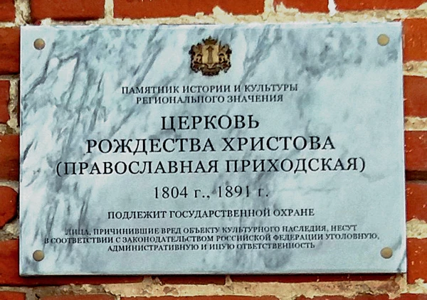 В 1651 году была построена первая деревянная церковь во имя Рождества Христова. В 1804 году на её месте была построена новая каменная церковь; в 1891 году на средства прихожан и пожертвования частных лиц перестроен, за исключением колокольни. Престолов в нём три: главный в честь Рождества Христова, в правом приделе — во имя Святителя и Чудотворца Николая и в левом — в честь Казанской иконы Божьей Матери[3].