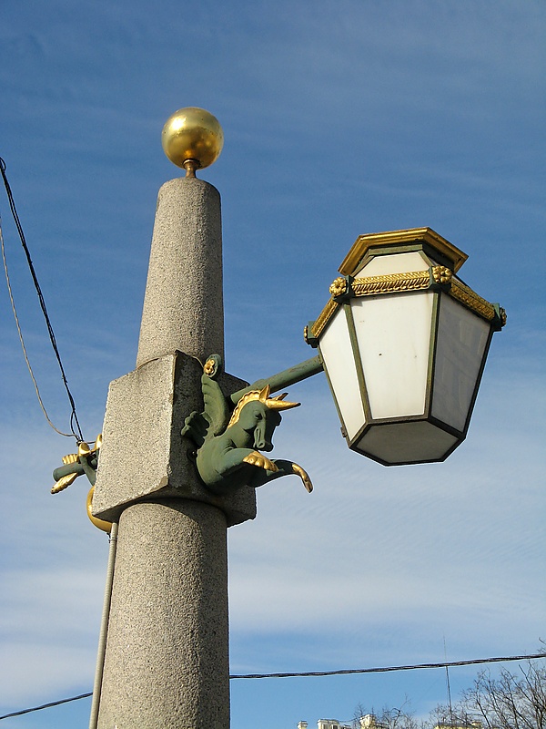 В 1915 году архитектор И. А. Фомин исполнил проект освещения моста. Согласно этому проекту при въездах на мост были поставлены четыре невысоких гранитных обелиска с гранеными фонарями, поддерживаемыми кронштейнами с золочеными фигурками морских коньков[26].