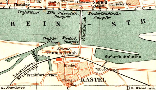 Рейнский мост (нем. Die Rheinbrücke) был построен в 1882—1885 годах по проекту архитекторов Фридриха фон Тирша и Бернхарда Бильфингера. Затраты на строительство составили 3,6 миллионов золотых марок. Торжественное открытие моста состоялось 30 мая 1885 года.