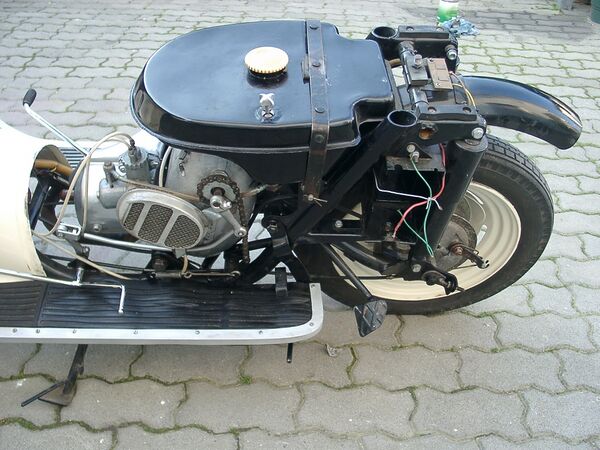 - Двигатель вместе с коробкой передач (с конца 1970-х годов — с вариатором) сблокирован с задним колесом и маятником.