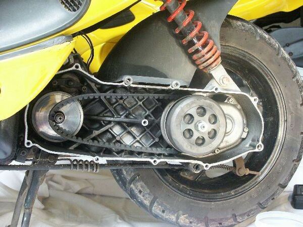 Первые мотороллеры имели обычную механическую коробку переключения передач и цепную передачу на заднее колесо. Сейчас почти всегда используются бесступенчатый клиноременной вариатор и автоматическое центробежное сцепление. В наиболее дешёвых мотороллерах вместо вариатора в том же (внешне неразличимом) корпусе ставится простая цепная передача, что сильно ухудшает динамику.