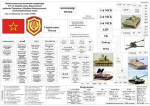 В среднем организационно-штатная структура советской мотострелковой дивизии в 1980-е годы включала в себя 3-и мотострелковых полка, один танковый полк, один артиллерийский полк, один зенитно-ракетный полк, отдельный реактивный артиллерийский дивизион, отдельный противотанковый артиллерийский дивизион и отдельные подразделения боевого обеспечения и тылового обеспечения.