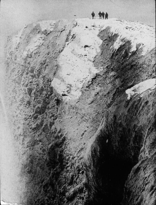 4 марта 1908 года Шеклтон объявил, что на следующий день начнётся восхождение на Эребус. Во время предыдущей экспедиции Р. Скотта, Ф. Уайлд и Э. Джойс, которые находились в составе нынешней команды, поднялись по его склонам до высоты 3000 футов. Начальник назначил в партию для восхождения Дэвида, Моусона, ассистента врача Маккея, а страховать их должны были Маршалл, турист Броклхёрст и Адамс. Первая тройка была снабжена провиантом на 11 дней, а группа поддержки — на шесть; общий вес снаряжения составил 600 фунтов. Выйдя рано утром 5 марта, экспедиционеры, ни у одного из которых не было альпинистского опыта, уже через милю пути были вынуждены в буквальном смысле на руках тащить свои сани по ледниковой морене. За весь день удалось преодолеть семь миль с восхождением на 2750 футов. На следующий день начались поля заструг, на которых нарты опрокидывались; в результате удалось пройти всего три мили, направляясь к основанию главного кратера. 7 марта Адамс постановил, что на вершину пойдут все вместе, причём нарты и большую часть снаряжения пришлось оставить в базовом лагере. На каждого приходилось теперь 40 фунтов груза, при том что никто не озаботился о рюкзаках или вещевых мешках. 8 марта на высоте 8750 футов температура упала до −34 °F (−37 °C), и началась метель; в течение 32 часов зимовщики не могли покинуть палатки. Броклхёрст, выйдя по нужде, поморозился, далее у него унесло ветром варежки, а когда он бросился их ловить, порывом ветра его сбросило в овраг. Когда его вернули в палатку, оказалось, что трёхместный спальный мешок забит мелким снегом, не позволяющим согреться. Наутро выяснилось, что Броклхёрст отморозил шесть пальцев на ногах, и в последнее восхождение его не взяли. Остальные обвязались верёвкой и за четыре часа изнурительного восхождения всё-таки добрались до кратера на вершине. Участники похода поднялись выше облаков, и им открылась пропасть шириной в полмили и видимой глубиной около 900 футов. Профессор Дэвид описал шаровидный клуб пара диаметром около 1000 футов, который вырвался из кратера у них на глазах, — так было объяснено наличие постоянного облака у вершины вулкана. Дэвид и Моусон усердно собирали геологические образцы, не считаясь с их весом, а также смогли построить геологический разрез. Были обнаружены глыбы застывшей лавы, кристаллы полевого шпата и фрагменты пемзы. Не менее интересны оказались скрытые под льдом и снегом фумаролы, в одну из которых чуть не угодил Маккей. Далее все сели на зады и спустились к Броклхёрсту по ледяным склонам. Этот метод применялся и для спуска ниже. К трём часам ночи все участники команды достигли нижнего лагеря, где обнаружили признаки начинающейся пурги. После этого они бросили нарты с образцами и вовремя достигли зимовочного дома. Маршалл описывал их состояние как «полумёртвое»[30][31].