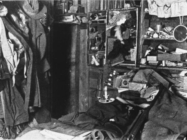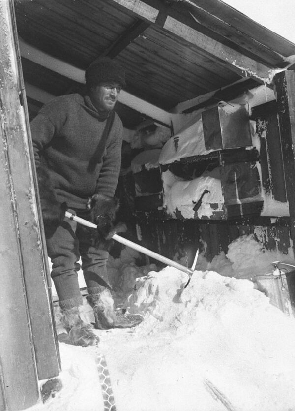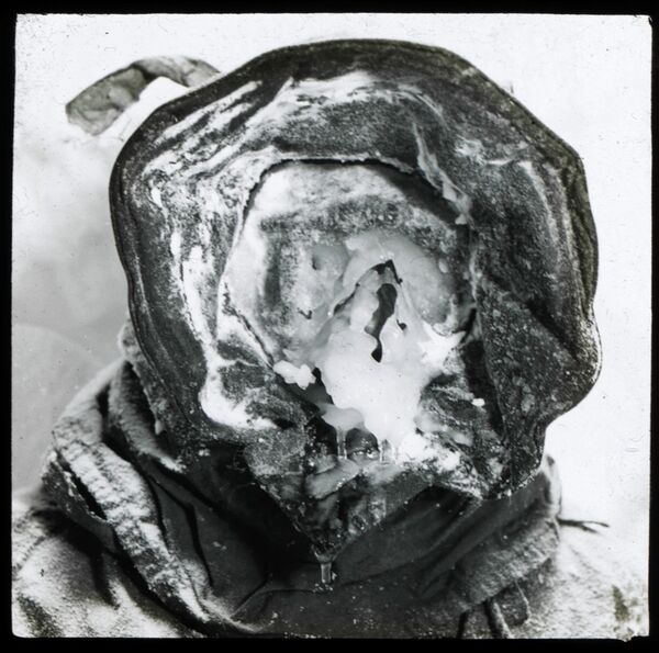 Команда на мысе Денисона обосновалась в одном из самых ветреных мест на планете Земля. Ураганный ветер, достигавший 80 миль в час, поднимался едва ли не ежедневно; зимой бывали и ещё более суровые условия — шквалы до 200 миль в час. Надёжную опору давали только альпинистские швейцарские кошки, но они требовали плотной шнуровки поверх тёплых мягких унтов, из-за чего значительно возрастала опасность обморожения ног. Любые работы на воздухе — включая доставку топлива со склада, пресного льда для растопки или метеорологические измерения — были опасны для жизни[65]. Однажды ассистента метеоролога — Ходжмана — снесло ветром, и он в течение двух часов не мог вернуться домой. В сильную метель лицо человека под капюшоном заносило снегом, который от тепла, выделяемого кожей и дыханием, смерзался в маску, как можно видеть на фотографии[66].