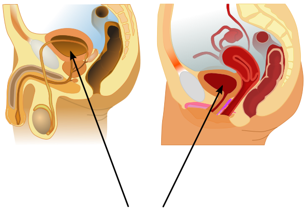 Мочевой пузырь у человека один, он располагается в малом тазу за лобком позади от лобкового симфиза, к задней поверхности которого прикрепляется лобково-пузырными связками (лат. ligg. pubovesicalia) у мужчин и латеральными лобково-пузырными связками (лат. ligg. lateralia pubovesicalia) у женщин. У мужчин дно мочевого пузыря срастается с передне-верхней частью предстательной железы, у женщин сзади-сверху прилежит передняя поверхность матки, разделённая покрывающим их листком брюшины, образующим пузырно-маточное углубление (лат. excavatio vesicouterina) в области тела матки и прикрепляющаяся соединительной тканью в области шейки матки, сзади срастается с передней поверхностью верхней части влагалища[8]. В зависимости от количества содержащейся в нём мочи мочевой пузырь может растягиваться и сжиматься. Вместимость мочевого пузыря составляет примерно 0,5 л[9]. По другим данным, у мужчин в норме она составляет 350—750 мл, у женщин — 250—550 мл[10]. Человек ощущает позыв к мочеиспусканию, когда объём мочи в мочевом пузыре достигает 150—200 мл. Если последний наполняется быстро, то позывы к мочеиспусканию следуют чаще, поскольку при быстром растягивании гладких мышц, образующих стенку мочевого пузыря, происходит более сильное раздражение присутствующих в этих мышцах барорецепторов[11].