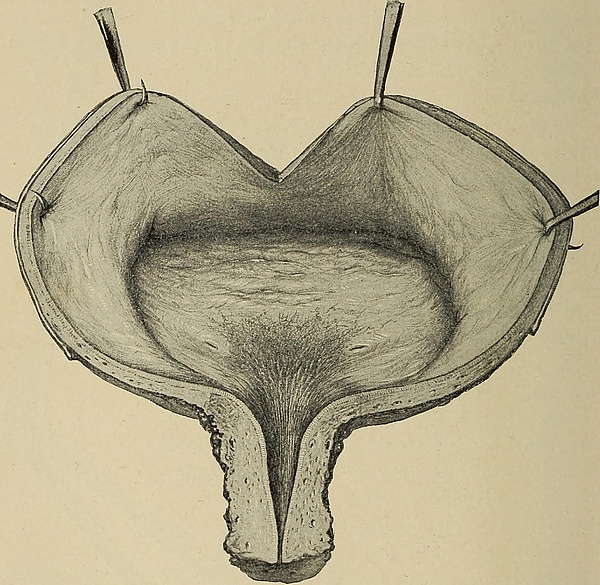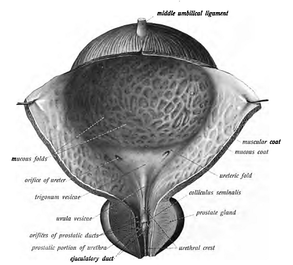 В средней части мочевого пузыря в него сзади под углом впадают два мочеточника. Благодаря тому, что они входят в мочевой пузырь в косом направлении, возникает своеобразный клапанный аппарат, который во время мочеиспускания, когда в мочевом пузыре повышается давление мочи, препятствует обратному затеканию мочи в мочеточники[11]. На слизистой оболочке основания пузыря выделяют мочепузырный треугольник (лат. trigonum vesicae), вершинами которого служат устья мочеточников и внутреннее отверстие мочеиспускательного канала. В области этого отверстия располагается толстая круговая мышца — внутренний сфинктер (лат. musculus sphincter urethae); он предотвращает непроизвольное мочеиспускание[13]. Мочеиспускание у мужчин блокируется также простатой физиологически временно в состоянии эрекции полового члена, или постоянно при некоторых его патологиях, к примеру при аденоме простаты.