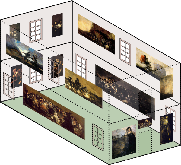 - Первый этаж: Это была большая прямоугольная комната. На длинных стенах было по два окна рядом с короткими стенами. На них висели две большие картины: Фестиваль в Сан-Исидро справа, если смотреть от входной двери, и Шабаш ведьм слева. На дальней короткой стене, напротив входа в центре находилось большое окно, справа от него находилась Юдифь и Олоферн, а слева Сатурн, пожирающий своего сына. Около двери висели Донья Леокадия Соррилья (напротив Сатурна) и Два старика или Старик и монах напротив Юдифи.