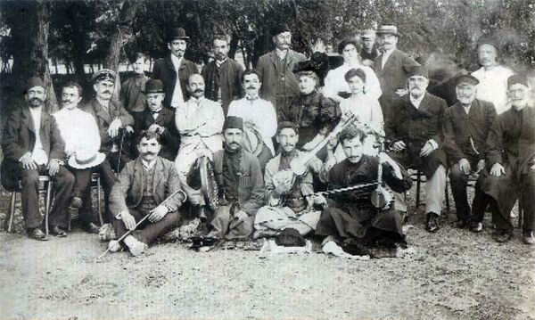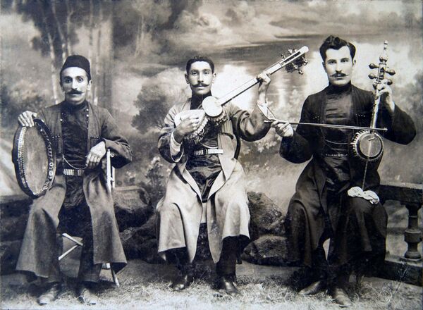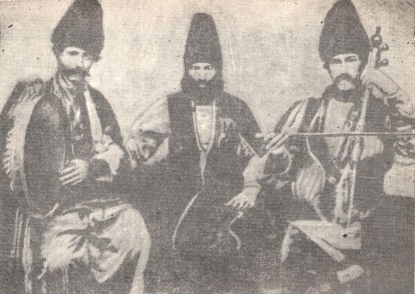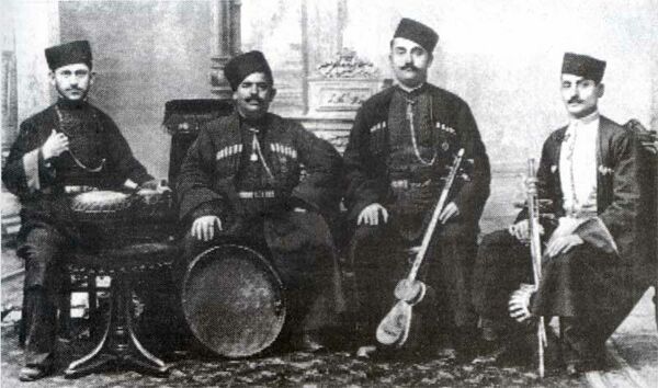 Значительное оживление в азербайджанском музыкальном искусстве стало наблюдаться во второй половине XIX века. Одним из направлений, в котором развивалась азербайджанская музыка, было творчество ханенде и сазандаров. Это направление олицетворяло наиболее сложный путь музыкального творчества[43]. Ансамбль сазандаров состоял из тариста, каманчиста, а иногда и гоша-нагарачи. Искусство сазандаров и мугаматистов получило в дореволюционный период высокое развитие[44]. Они исполняли мугамы, выступали на народных праздниках и свадьбах, а также в частных домах. Эти ансамбли исполняли как собственно мугамы, теснифы, дирингэ[прим. 3] и оюн хавалары[прим. 4], так и дестгях, представляющий собой цикл музыкально-инструментальных и вокальных номеров[8]. Выступления ханенде XIX века по имени Саттар на собраниях в Тифлисе и на общественных концертах были высоко оценены Мирзой Фатали Ахундовым, Хачатуром Абовяном, Георгием Эристави, Николаем Бараташвили, Яковом Полонским, а также прессой того времени. Яков Полонский посвятил ему стихотворение под названием «Саттар»[45]. В малоизвестном примечании (Стихотворения. СПб., 1855, с. VII, примечание) к имени Саттара Полонский сообщает: