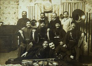 | Исполнитель мугамов ханенде Сеид Шушинский (второй слева) со своим ансамблем в 1916 году | |