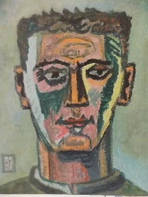 На зелёновато-сером фоне изображена голова мужчины в фас с открытой высокой шеей. Мужчина отличается короткими коричневыми волосами, прямым носом, большими глазами и ярко-красными губами. На розовом лице выделяются жёлтые, зелёные и оранжевые тени, что придаёт работе выразительность и подчёркивает использование необычной цветовой гаммы. В нижней части композиции заметен небольшой фрагмент зелёной куртки.