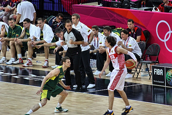 Матч между сборными России и Литвы был первым четвертьфиналом на турнире по баскетболу в Лондоне-2012. После равного начала подопечные Дэвида Блатта совершили рывок «+9» и на протяжении долгого времени удерживали преимущество в 5-7 очков (42:27, после первой половины встречи). В третьем периоде преимущество россиян составило 14 очков (64:50), однако литовцы на старте заключительной четверти сократили отставание до минимального. Тем не менее сборной России удалось вновь захватить инициативу и одержать победу со счётом 83:74. В полуфинале россиянам предстояло встречаться с победителем матча между сборными Франции и Испании. Самым результативными игроками сборной России стал Андрей Кириленко (19 + 13 подборов + 3 перехвата + 3 блок-шота), Тимофей Мозгов (17 + 4 подбора), Виктор Хряпа (12 + 8 передач + 6 подборов) и Виталий Фридзон (11). В сборной Литвы лучшими были Римантас Каукенас (19), Дариус Сонгайла (15 + 5 подборов + 3 перехвата), Римас Калниетис (14) и Йонас Валанчюнас (7 + 9 подборов)[17].