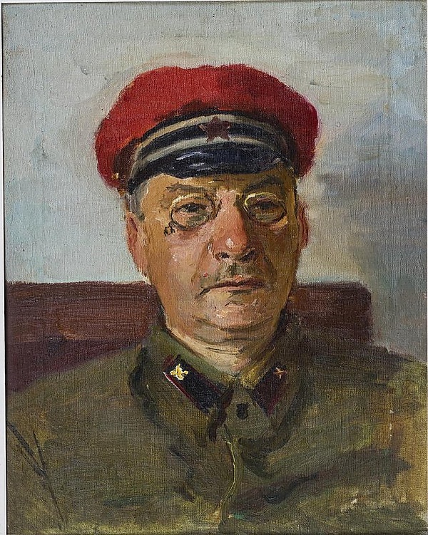 На полотне представлено погрудное изображение мужчины, обращённого в три четверти вправо. Он одет в гимнастёрку серо-зелёного цвета с чёрными петлицами, украшенными жёлтыми эмблемами, и фуражку с чёрным козырьком, малиновым верхом и красной звёздочкой. Лицо мужчины выделяется маленькими чёрными глазами с пронзительным взглядом за овальными стёклами пенсне, широкими вразлёт бровями, широким носом с горбинкой и резко очерченными ноздрями, а также узкими сомкнутыми губами и намеченными усами над верхней губой. Коротко остриженные седые волосы заметны над правым ухом. За спиной изображена коричневая прямоугольная полоса, фон выполнен в голубовато-серой цветовой гамме.