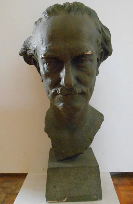Скульптура представляет портрет пожилого мужчины. Лицо портретируемого худощавое. Высокий лоб с крупными залысинами и густые брови подчёркивают его особенности. Глаза слегка на выкате, взгляд задумчиво устремлён вправо. Под глазами прослеживаются морщины, нос имеет небольшую горбинку, а над верхней губой расположены густые усы. Прямые удлинённые волосы зачёсаны назад. Изображение выполнено с постановкой на одну точку, что придаёт композиции устойчивость. Поверхность скульптуры шероховата, обработана с тщательной проработкой деталей и тонирована под тёмную бронзу. Невысокий прямоугольный постамент выполнен с сглаженной поверхностью, тонированной под серый камень. Размер скульптурного портрета составляет 56×31×28 см.