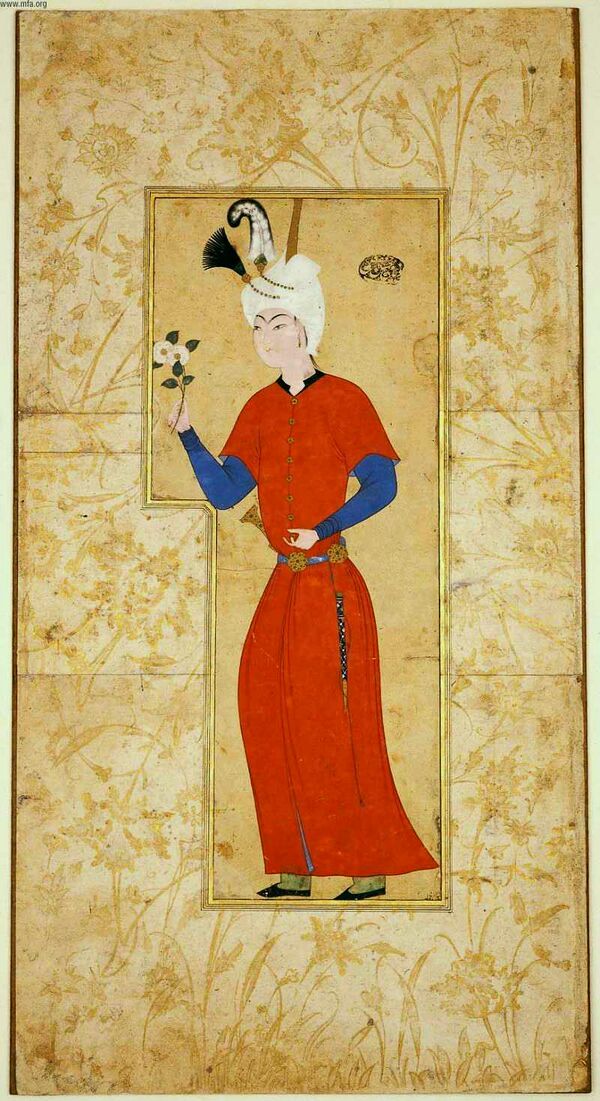 После того, как в результате изнурительных войн с османами шах Тахмасп перевел столицу подальше от границы с ними, в город Казвин, Музаффар Али последовал за шахом туда. Тахмасп по-прежнему считал художника лучшим среди своих мастеров, поэтому, построив в Казвине новый дворец Чихиль Сутун (Сорок колонн), роспись залов доверил именно ему. Кроме миниатюр и стенных росписей Музаффар Али создавал портреты на отдельных листах. К таким относится «Портрет юного принца с цветами» из бостонского Музея изящных искусств.