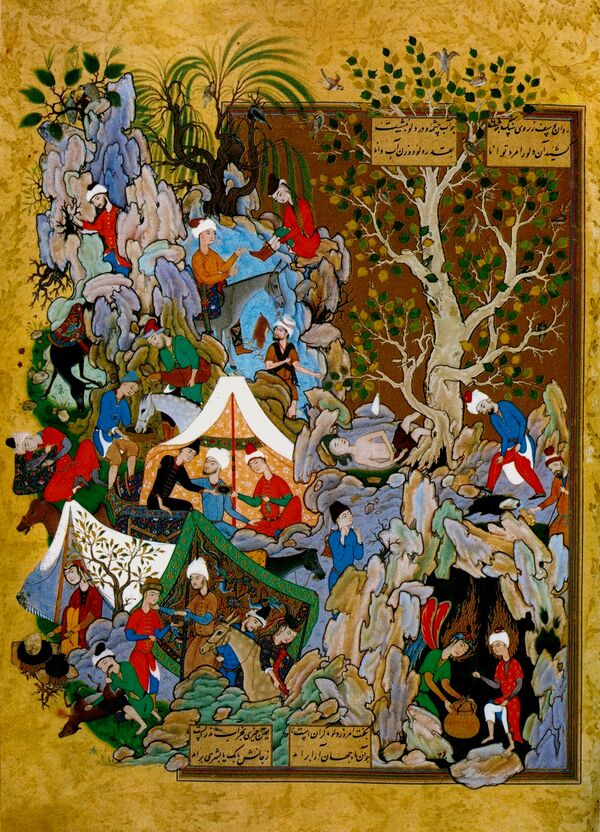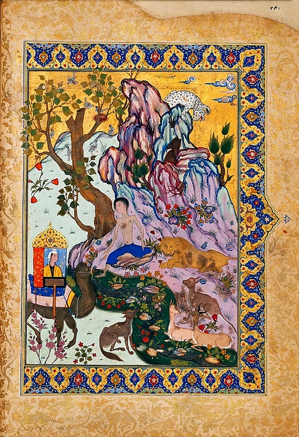 Однако позднее, когда в 1540-50х годах шах Тахмасп потерял интерес к книжной миниатюре, Музаффар Али, судя по всему, перешел на службу к его племяннику, губернатору Мешхеда Султану Ибрагиму Мирзе, приняв участие в иллюстрировании еще одного книжного шедевра – рукописи «Семь престолов» (Хафт Ауранг) поэта Джами (1556-65гг, Вашингтон, Галерея Фрир). Наряду с Музаффаром Али над книгой работали шесть художников, и среди них Мирза Али и Шейх Мухаммад. Одна из лучших миниатюр этого манускрипта – работа Музаффара Али «Юсуф выбирается из колодца» на сюжет из поэмы «Юсуф и Зулейха». Юсуф (библейский Иосиф) стал героем поэмы Джами, сочинившим по библейским мотивам совершенно оригинальное произведение. На миниатюре изображен момент, когда, сброшенному братьями в колодец Юсуфу, приходит на помощь архангел Джибраил (Гавриил), и предлагает забраться в кувшин, к которому привязана веревка. Однако, эта сцена занимает лишь угол композиции, на всем остальном поле миниатюры развернуто изображение привала купеческого каравана (именно сердобольный купец Малик из проходившего мимо каравана спас Юсуфа), и различных бытовых сценок, среди которых можно видеть две гомоэротического содержания, которые как будто подтверждают мнение некоторых ученых о том, что в сефевидской Персии нравы в этом отношении недалеко ушли от древнегреческих.