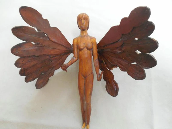 Скульптура выполнена из дерева. На ней изображена женская обнажённая фигура с резными крыльями. Лицо проработано нечётко. Волосы прямые и короткие. Правая рука согнута, левая вытянута вдоль тела. Фигура держит инструменты скульптора: молоток и резец. Молоток имеет обломанную часть. У фигуры отсутствуют ступни. Размер произведения составляет 18×182×97 см.