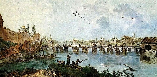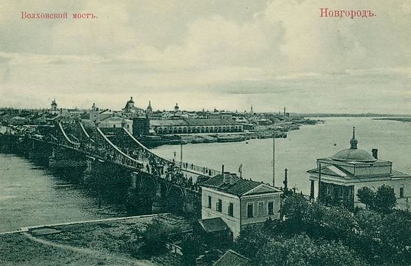 Первые упоминания о мосте, соединявшем Новгородский кремль и Ярославово дворище, содержатся в Иоакимовской летописи, сохранившейся в изложении Василия Татищева, русского историка XVIII века. При описании процесса крещения новгородцев Иоакимом Корсунянином в конце 989 — начале 990 года в летописи сказано, что отказавшиеся принимать крещение жители Новгорода демонтировали фрагмент моста, чтобы крестители Иоакима не прошли на левый берег (на Софийскую сторону)[4].