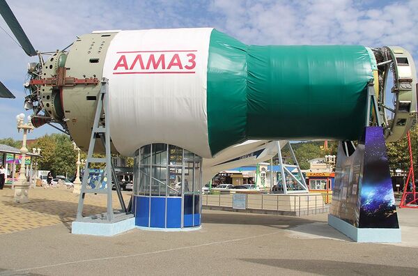 В музее экспонируется макет пилотируемой орбитальной станции «Алмаз», которая была создана для фото- и радиотехнической разведки в рамках задач Министерства обороны СССР. Представлены подлинные элементы станции: модуль орбитальной станции (в составе уличной экспозиции), система спускаемой капсулы и артиллерийская пушка «Щит-1»[10][11].