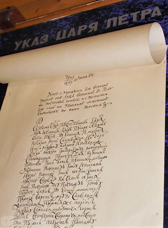 Импульсом к созданию музея почтовой связи в городе Великие Луки послужила находка исторического артефакта — указа Петра I, изданного в 1697 году и обнаруженного в одном из рассекреченных архивов МВД России. Чтобы расправить свёрнутый лист бумаги с указом, специалисты смазали поверхность бумаги специальным составом. В документе содержалось распоряжение о создании «…для всяких писем от Лук Великих до Пскова почтовой гоньбы и о поставке для оной на указанных местах стрельцов по пяти человек», в узлах тракта Великие Луки — Навлиц (Локня) — Калков (Новоржев) — Вороноч (Пушкинские Горы) — Остров — Псков были основаны почтовые станции. Первая почтовая контора появилась в городе значительно позже — в 1857 году, телеграф начал функционировать в 1898 году[1][5].