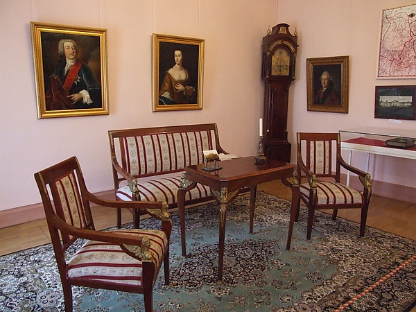 Во всех помещениях музея провели реконструкцию и воссоздали интерьеры господского дома. Выставочное пространство начинается с серии портретов бывших хозяев усадьбы и герба Строгановых, на котором изображён рыцарский щит, разделённый лентой с тремя остриями копий, символизирующий поход Ермака в Сибирь — на средства семьи Строгановых была осуществлена экспедиция по освоению новых земель. В углу герба расположен повёрнутый рыцарский шлем, представляющий самодостаточность семьи и её верность государю.
