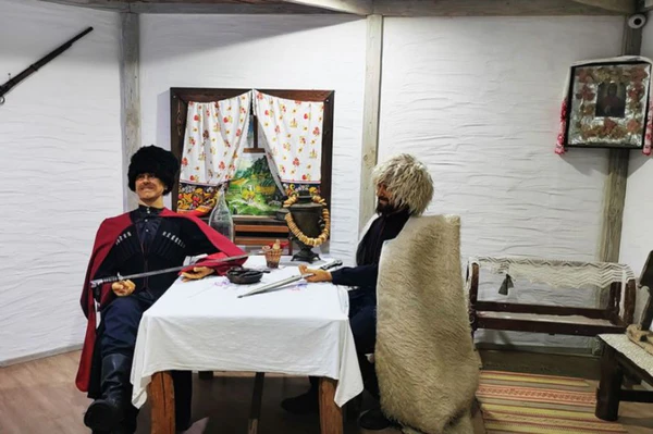 - «Казачья хата». В интерьере казачьей хаты второй половины XIX века пространство традиционно разделено на две половины — мужскую и женскую. В числе экспонатов — русская печь, прялка, кухонная утварь, предметы мебели, манекены черкеса и казака Кубанского казачьего войска[1].