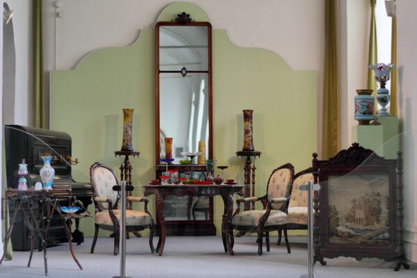 В двух боковых выставочных разделах зала спроектированы фрагменты интерьеров середины XIX и начала XX веков. Первый раздел воссоздаёт образец роскошной сервировки стола русского дворянина XIX века, с хрустальными напольными канделябрами, вазами и кубками. Раздел «Уголок гостиной» оформлен в стилистике модерна начала XX века, представлены аутентичные образцы мебели и посуды[7].