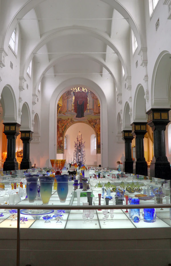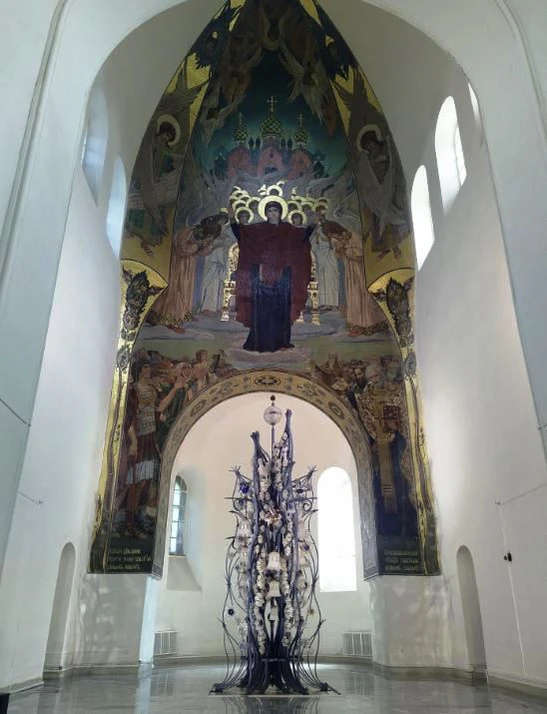 При входе в выставочное пространство взгляду посетителя предстаёт мозаика «О Тебе радуется, Благодатная!» и ажурная кованая композиция «Гимн стеклу» высотой шесть метров, пропорционально вписанная в пространство апсиды и декорированная более чем 300 хрустальными цветами, между которыми расположены синие и красные стеклянные птицы и колокольчики из серебра. Произведение декоративно-прикладного искусства «Гимн стеклу» было создано художниками Владимиром Сергеевичем Муратовым и Владимиром Ивановичем Касаткиным[7].