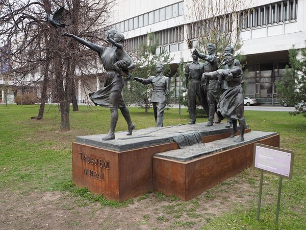 Скульптура была создана в 1950 году Верой Мухиной. До 1994 года она располагалась на ВДНХ. После расширения проспекта Мира скульптуру передали в парк Музеон, куда она попала в неполном виде; ей не хватало половины элементов. В 2013 году «Требуем мира» отреставрировали и восстановили целостность памятника, который изображает шесть фигур: темнокожий, китаец и русский идут по поверженным знаменам немецкой армии, сбоку расположены фигуры инвалида и матери с мертвым ребёнком на руках, а возглавляет шествие женщина, с руки которой слетает голубь — символ мира[25].