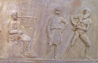 Музыка нашла своё отражение в древнегреческой мифологии. Древнейшая эпоха музыкального развития связывалась в греческих преданиях с именем мифического силена Марсия, который вступил в музыкальное состязание с Аполлоном, победил его, и тем самым вызвал его гнев. Фригийское происхождение Марсия указывает на влияние музыкальной культуры Малой Азии на Грецию.