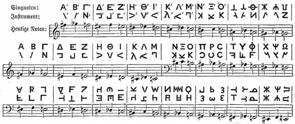 Мелодия записывалась с помощью греческих и финикийских букв, причём различные графемы (буквы и их графические модификации) использовались для вокальной и инструментальной музыки. Схема ниже иллюстрирует соответствие греческой буквенной нотации и классической пятилинейной: