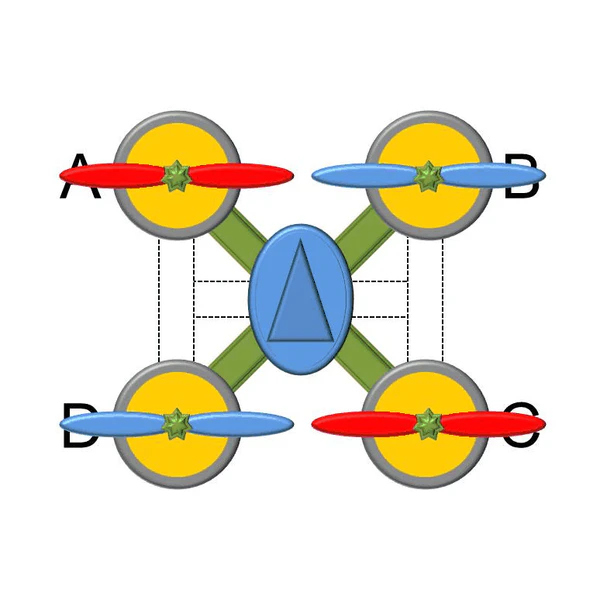 - ускорить винты, вращающиеся по часовой стрелке, и замедлить вращающиеся против — поворот в плоскости.