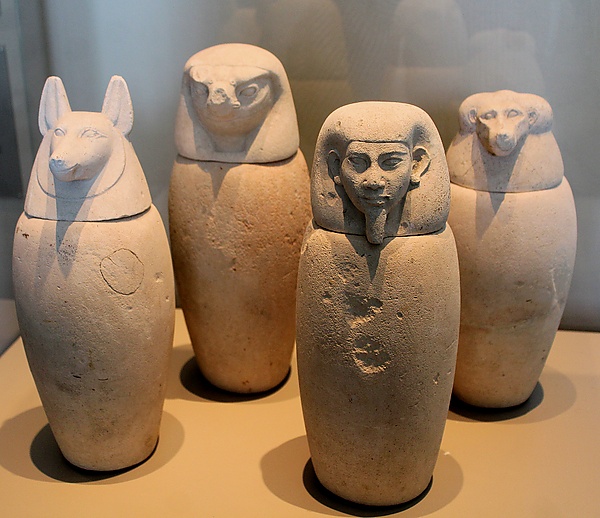 Внутренности знатных особ помещались в отдельный сосуд и бросались в реку или — в особом сосуде «канопа» — возлагались при трупе[3]. Крышки четырёх каноп представляли собой головы гениев смерти (человек, шакал, ястреб и обезьяна)[2].
