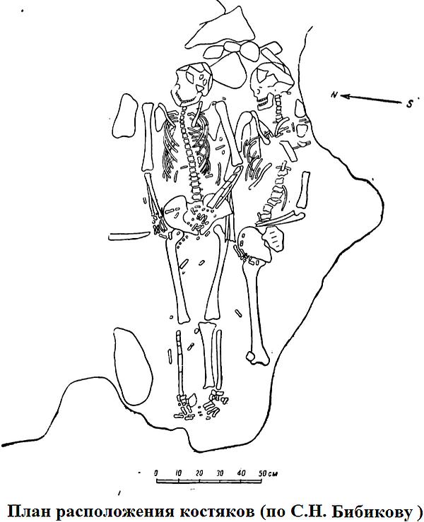 Во время закладки разведочного шурфа в этом слое был обнаружен череп человека, примятый камнями. В дальнейшем, в процессе подготовки площадки для извлечения погребения, был обнаружен и второй череп человека. Таким образом, было установлено, что здесь имеет место двойное погребение. Обстоятельства захоронения, в которых обнаружены оба костяка, не оставляют никаких сомнений в том, что они относятся к третьему слою[3].