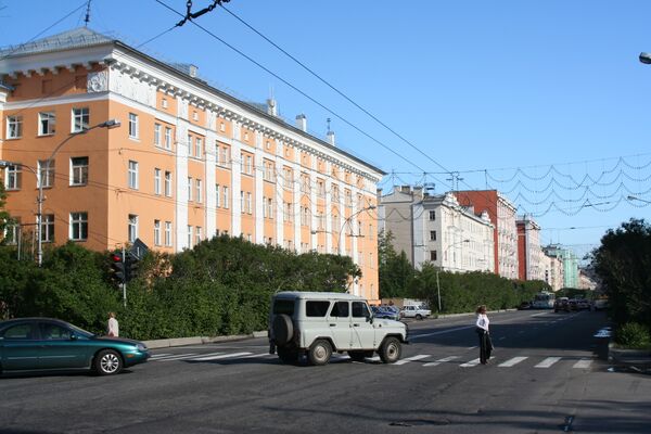 Со второй половины 1920-х годов город стал быстро развиваться, поскольку у Советского Союза возникла стратегическая потребность в обустройстве крупного порта, транзит через который не зависел бы от отношений с соседними странами. Прокладывались улицы с деревянными тротуарами и рядами одно- и двухэтажных рубленых домов. В 1927 году появилось первое многоэтажное здание из кирпича, сохранившееся до наших дней[27]. С 1927 года Мурманск — центр одноимённого округа в составе Ленинградской области. С 1933 года Мурманск являлся одной из баз снабжения и судоремонта для Северного флота. Помимо военно-стратегических целей, через порт осуществлялось морское сообщение со строящимся Норильским ГМК, развитие мурманского порта преследовало и задачу увеличения уловов рыбы: в городе на месте прежнего военного предприятия по рыбообработке и судоремонту был создан рыбный порт, который начал быстро развиваться и уже через несколько лет обеспечивал поставки в другие районы СССР по двести тысяч тонн рыбы ежегодно[28].
