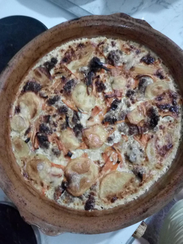 - В болгарской кухне мусака — это запечённая смесь мясного фарша и картофеля (реже баклажанов или кабачков) с заливкой из йогурта и яиц (или молока)[33][31]. Национальное блюдо «гювеч» из различных овощей, картофеля и мяса похоже на греческую мусаку.