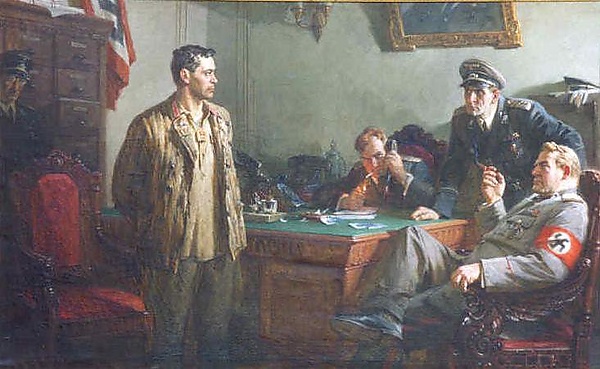 Картина представляет собой многоплановую композицию в рамках батального жанра. На правой стороне за массивным столом, покрытым зелёным сукном, изображён мужчина в военной форме, держащий в левой руке телефонную трубку, а в правой — зажигалку. Справа от него стоит ещё один мужчина в военной форме, изображённый по пояс в 3/4 повороте влево. На переднем плане справа сидит в кресле мужчина в профиль с сигаретой в руке. Слева у стола находится мужчина в 3/4 повороте вправо, одетый в гимнастёрку и потрёпанный китель с петлицами, за ним видны кресло, шкаф и погрудный портрет мужчины в очках, также в военной форме.