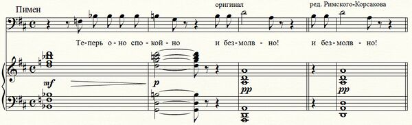 - Опера «Борис Годунов» (1869, 2-я ред. 1872)[34]. По мотивам одноимённой трагедии А. С. Пушкина. Премьера (2-я редакция, с купюрами): Петербург, Мариинский театр, 27.01.1874. Критическое издание партитуры и клавира во 2-й редакции: П. А. Ламм (1928). Премьерная постановка оригинальной (так называемой «первой», или «первоначальной») редакции: Москва, Муз. театр Станиславского и Немировича-Данченко в марте 1929 г.[35]; в редакции Е. М. Левашёва — в том же театре, в декабре 1989 (под руководством Е. В. Колобова).