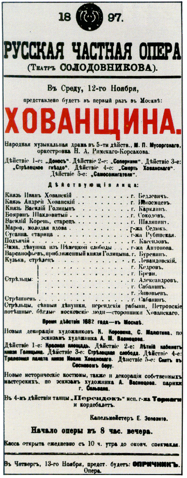 В XIX веке полномасштабные постановки опер Мусоргского были чрезвычайно редки. Опера «Борис Годунов» была поставлена в 1888 г. на сцене московского Большого театра. В конце ноября 1896 г. она же была поставлена в Петербурге на сцене Большой залы Музыкального общества (новое здание Консерватории) при участии членов «Общества музыкальных собраний». Первое исполнение «Хованщины» состоялось в 1886 году в Петербурге, в зале Кононова[31], силами любительского Музыкально-драматического кружка. На профессиональной оперной сцене «Хованщина» была поставлена впервые в 1897 г. в Русской частной опере Мамонтова (на сцене Театра Солодовникова, с участием Ф. И. Шаляпина).