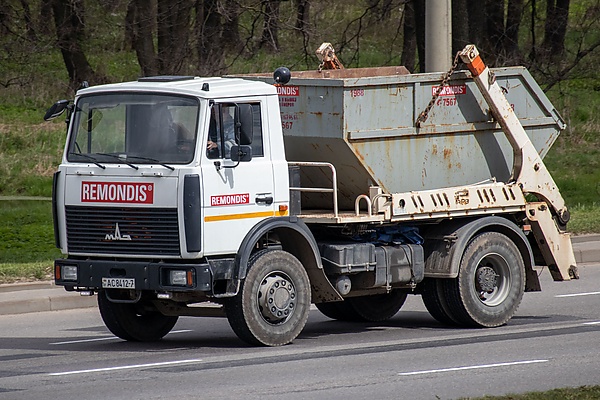 - Для вывоза крупногабаритных отходов (строительный мусор, макулатура) используются открытые или закрытые бункеры (крупногабаритные контейнеры) вместимостью 5 м³ и выше. Их перевозят специальные самосвалы-бункеровозы с портальной загрузкой или мусоровозы типа «мультилифт». При нехватке средств муниципалитеты могут использовать промышленные контейнеры и для накопления обычных, бытовых, отходов.