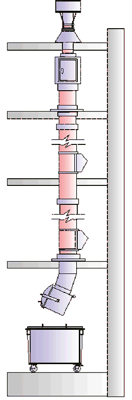 - Облегчает организацию раздельного сбора мусора, если ствол мусоропровода предусмотрен для раздельного сбора. В современных системах ствол мусоропровода предусматривают в новых домах с раздельным сбором мусора с 2-3 загрузочными клапанами на этаже и один общий ствол или ствол с одним загрузочным клапаном и автоматическим делением мусора в различные контейнеры, установленных в мусорокамеры[6][7][8][9][10].