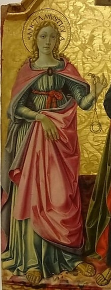Св. Мустиола также была схвачена и после того, как Ириней принял мученическую кончину, она была забита до смерти. Сообщается, что при попытке бежать из-под римской стражи, св. Мустиола пересекла озеро Кьюси, используя свой плащ, как лодку. Также сообщается, что 3 апреля каждого года, на рассвете, на берегу озера бывает можно увидеть след от плаща св. Мустиолы.