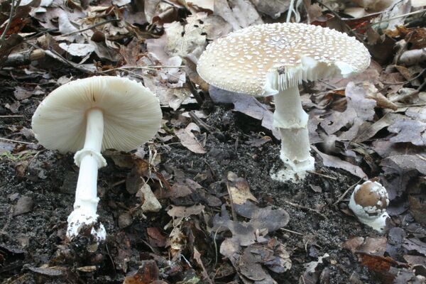 - Мухомор серо-розовый (Amanita rubescens), отличающийся розовеющей на воздухе мякотью и штриховатой верхней поверхностью кольца.